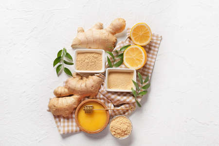 Ginger root slices and powder and ginger cubes with sugar on light kitchen background.