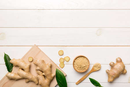ginger on cutting board table, top view. Space for text.