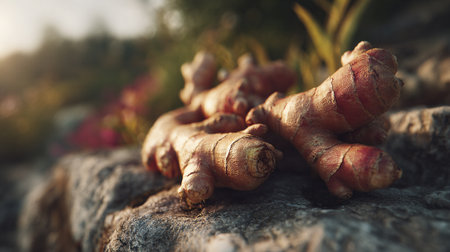 Organic Ginger Root Resting Naturally on a Rock in Golden Sunlight