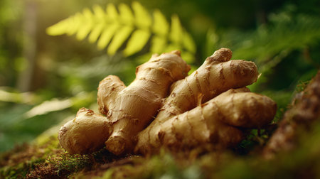 Fresh ginger root nestled among ferns in a vibrant, natural environment