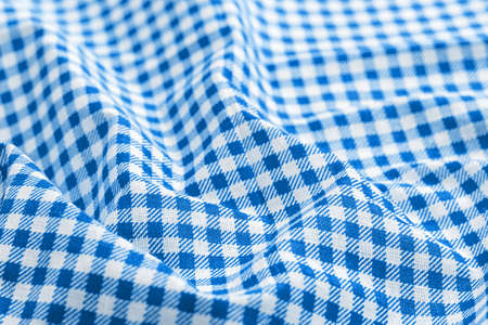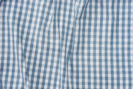 Classic blue and white checkered fabric texture. Crumpled bright colored cotton background. Selective focus. Closeup view