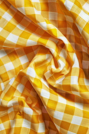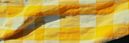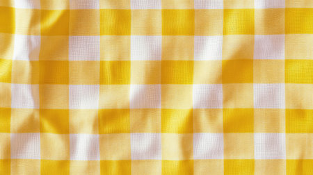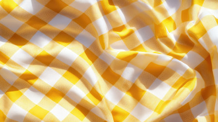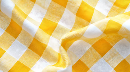 Close-up captures the texture of a yellow and white checkered fabric. Gentle folds create dynamic shadows, emphasizing the woven pattern and adding depth to the image.