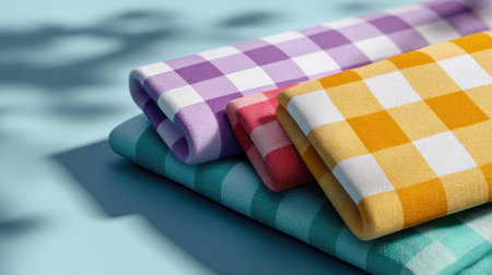 A vibrant display of colorful checked fabric rolls on a light blue background, perfect for crafting projects or home decor enhancement, featuring various pastel shades.