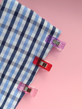 Plaid fabric in white, light blue and blue secured with sewing and cutting clips in different colors