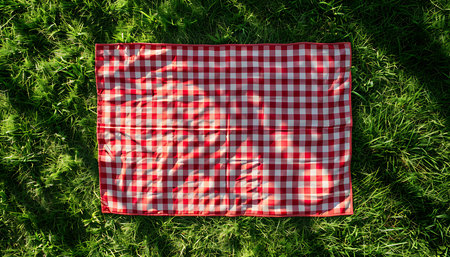 Sunlit red and white checkered tablecloth with soft sunflare. That the image is generated using AI.