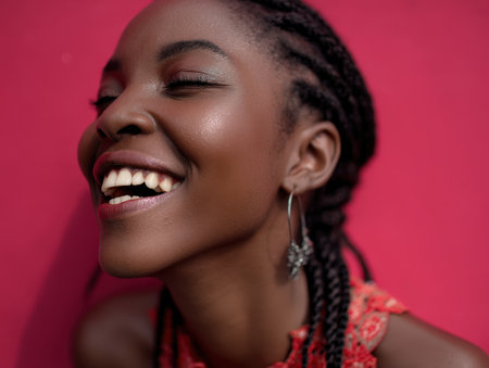 Smiling person with braided hair, silver hoop earring, closed eyes, and wearing red detailed top, depicted in a joyful expression against a solid backdrop, showcasing natural beauty