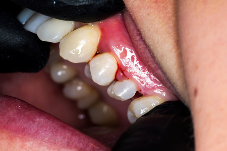 Gum bleeding and inflammation close up. A man examined by a dentist. The diagnosis of gingivitis