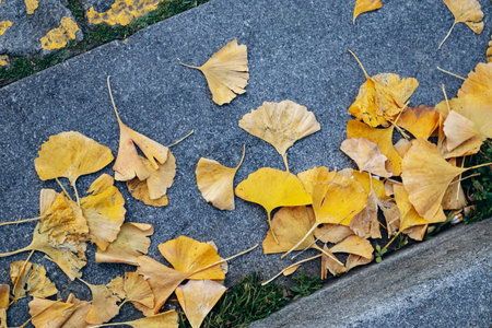 Golden ginkgo leaves lying on the ground in a park of London, United Kingdom