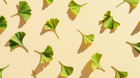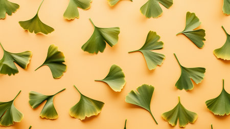 Flat lay of green ginkgo biloba leaves, copy space, beige pastel background, presentation template. Generative AI.