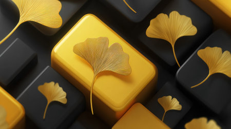 , abstract rendering featuring a geometric arrangement of smooth, rounded rectangular blocks in bright yellow and matte black. Numerous stylized golden ginkgo leaves are scattered across the surface, some resting on the blocks while others appear to float or emerge from the background, creating a rich, luxurious visual texture based on the striking color contrast.