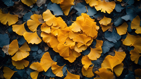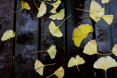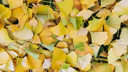 Ginkgo leaves on the ground in autumn. Autumn background.