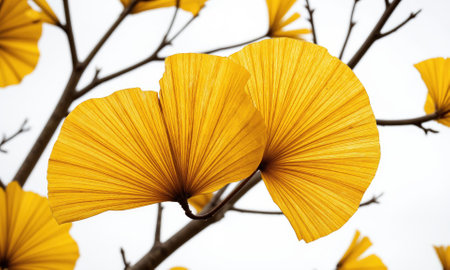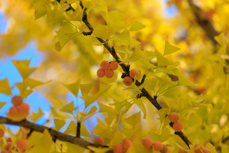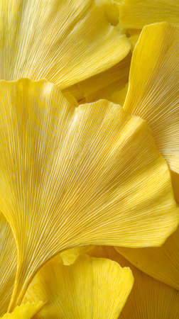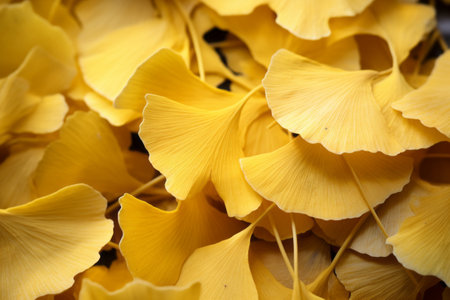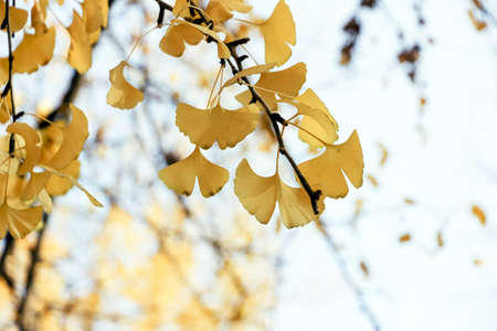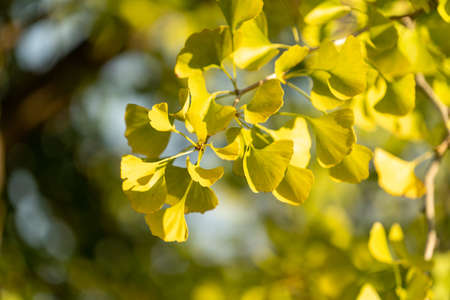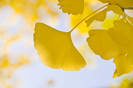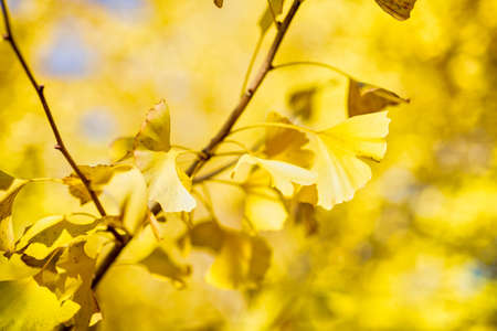 Close up of Ginkgo Biloba yellow leaves. Fresh and vibrant leave of Yin Xing tree. Natural foliage background. The maidenhair tree native to China has various uses in traditional medicine.