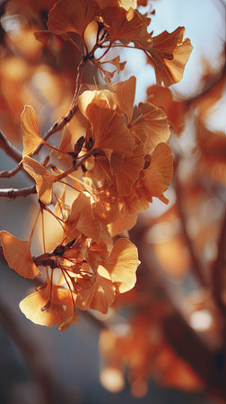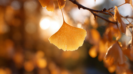 Ginkgo leaves hang from a branch, illuminated by warm sunlight in autumn