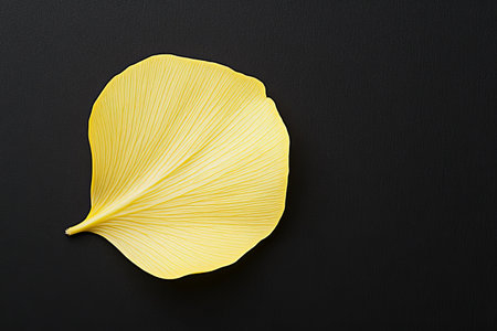 Delicate flat flower petal lies on a black background, highlighting its vibrant yellow color and detailed texture, evoking natures elegance.
