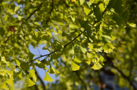 Ginkgo biloba green leaves on the tree. Ginkgo biloba tree leaves with sunbeams. healing. herbal medicine