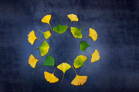 Healing yellow and green leaves of ginko biloba in a circle on a dark background. Ginko leaves for memory, longevity and health in traditional oriental medicine. Place for text Therapeutic natural of Chinese medicine