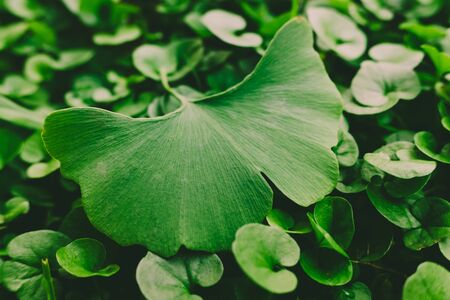 Close up of fresh vibrant green ginkgo biloba leaves. Natural foliage background.