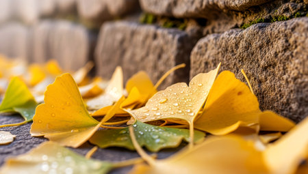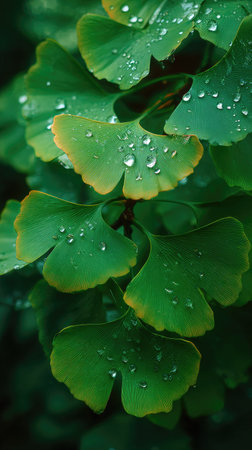 Ginkgo Biloba leaves adorned with dewdrops, basking in soft, dappled sunlight.