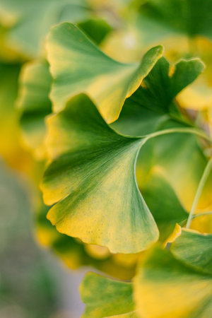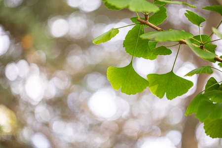 Ginkgo biloba young green leaves on a tree. Wellness healing plant, symbol of health and longevity.