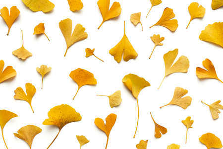 Autumn background: Yellow ginkgo leaves isolated on white. View from above. Flat lay. Cut out.