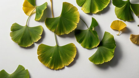 Several ginkgo biloba leaves with yellowing edges are scattered on a white surface, hinting at autumn, ideal for seasonal designs and health publications.