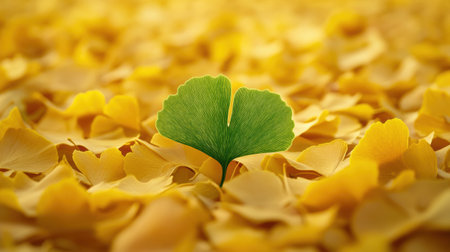 A closeup shot of a vibrant yellow ginkgo biloba leaf amidst a sea of yellow petals. The leaf is the central focus, with its bright green color contrasting against the surrounding yellow hues.