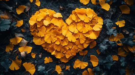 Flat lay of yellow ginkgo biloba leaves, copy space, black background, presentation template. Generative AI.