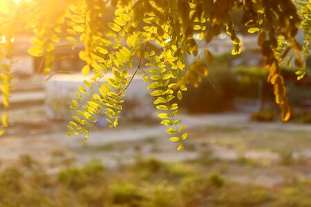 Yellow acacia flowers and branches with green leaves. Natural outdoors garden park background