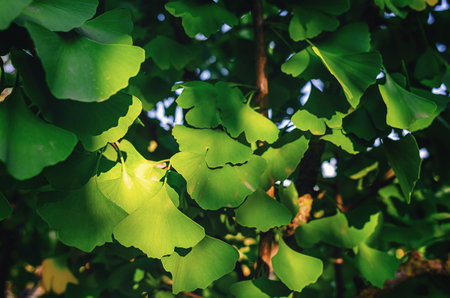 Ginkgo biloba young green leaves on a tree. Wellness healing plant, symbol of health and longevity.