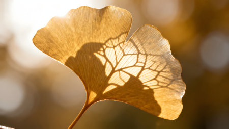 Golden Ginkgo Leaf on Warm Beige Background with Soft Shadows in Sunlight