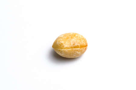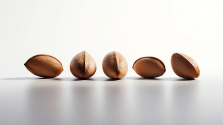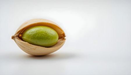 Close-up on a cracked open pistachio on a stark white background, highlighting its natural texture.