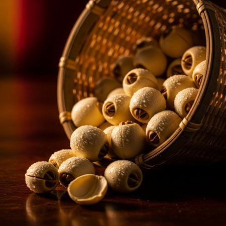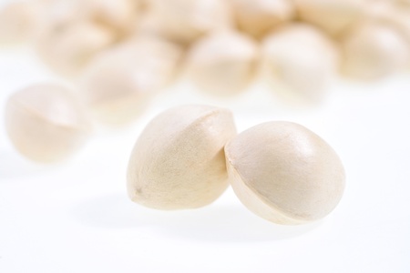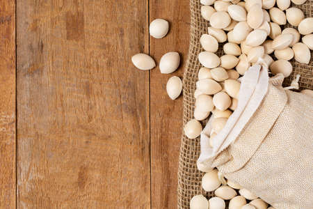 Top view of healthy Lotus seeds in wooden bowl on white background. Copy space available.
