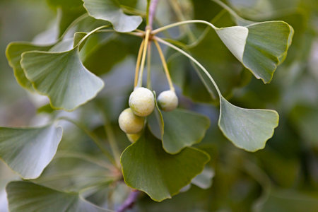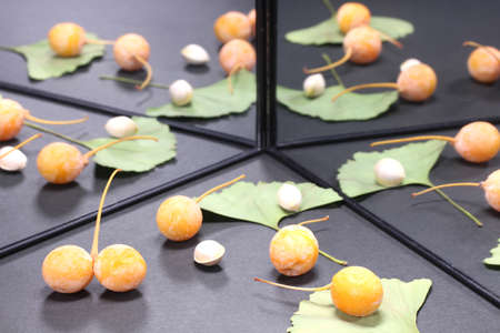 Ginkgo biloba fruits and leaves reflecting in the mirror