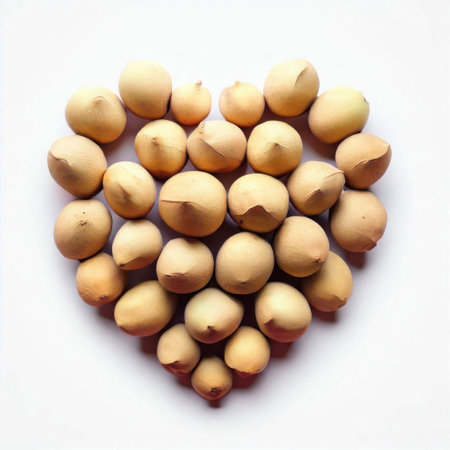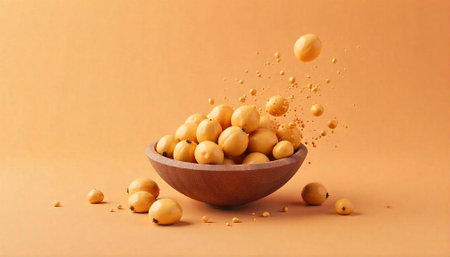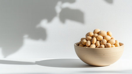 Soybeans in a ceramic bowl on a clean white surface, with subtle shadows enhancing their round shapes.