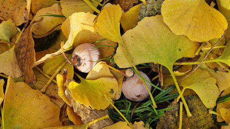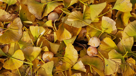 Ginkgo biloba yellow autumn leaves and fruits, fallen on the ground. Close-up view.