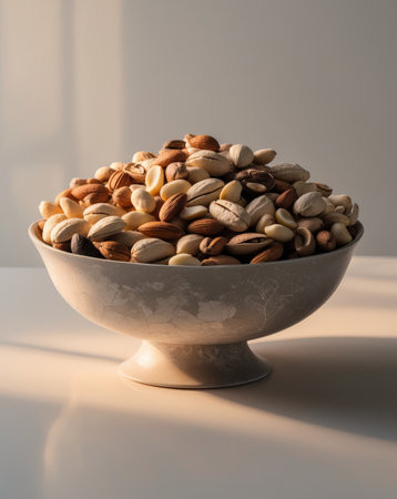 AI Generated. Fresh Mixed Nuts in Decorative Bowl with Natural Light Reflection