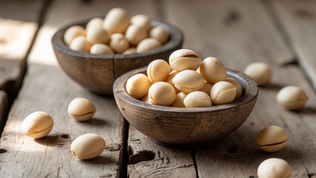AI Generated. Macadamia nuts in wooden bowls on rustic wood table