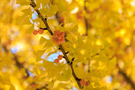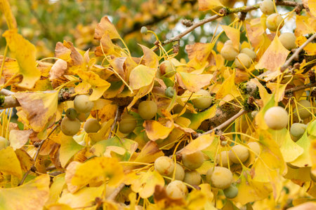 Ginkgo biloba branch with yellow leaves and berries in autumn