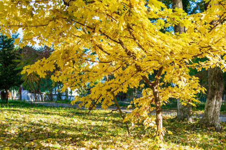 Full yellow Japanese Leaf on the tree with blue sky background in the garden. The leaves change color from green to yellow and red in autumn.