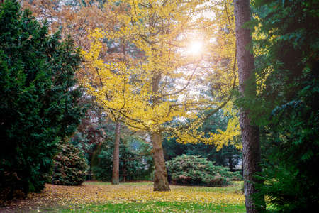 Beautiful yellow ginkgo, gingko biloba tree forest in autumn season in sunny day with sunlight and blue sky.
