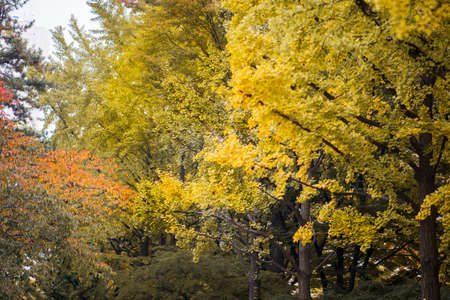 Ginkgo trees yellowing during autumn season taken close up in Seoul Childrens Grand Park.
