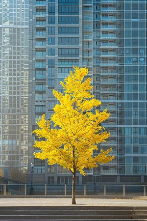 A lone, vibrant tree stands in stark contrast to the surrounding high-rise urban landscape, a symbol of nature in the city.