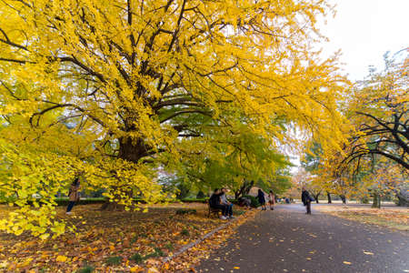 Yellow Ginkgo Trees in Autumn and Blue Sky at Ueno Park Japan