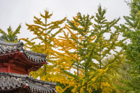 Golden-yellow Ginkgo biloba trees rise behind a traditional East Asian building. The blend of architecture and autumn color evokes calm harmony.
