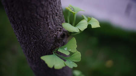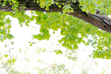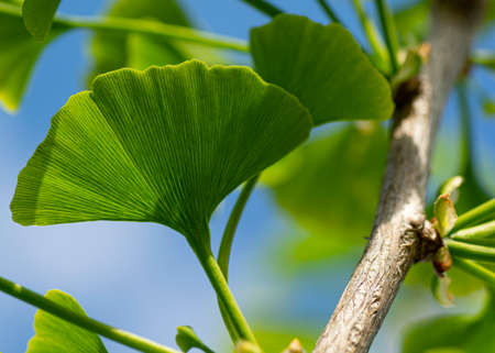 Fresh bright green leaves of ginkgo biloba. Latin name Ginkgo biloba L. Branches of a ginkgo tree in Nitra in Slovakia.