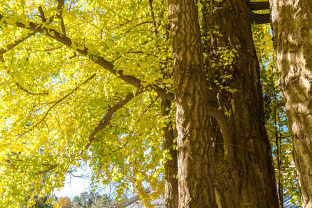 Beautiful yellow ginkgo, gingko biloba tree forest in autumn season in sunny day with sunlight and blue sky.