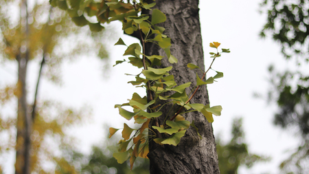 Thin tree trunk closeup. Cracked bark of the young Ginkgo Biloba tree with yellow leaves in autumn forest. Beautiful natural background