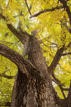 ancient ginkgo tree in autumn, upward view of golden leaves