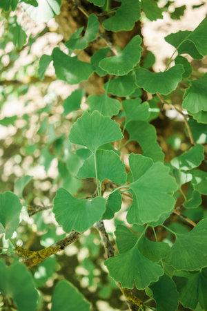 Ginkgo biloba green leaves on the tree. Ginkgo biloba tree leaves with sunbeams. healing. herbal medicine