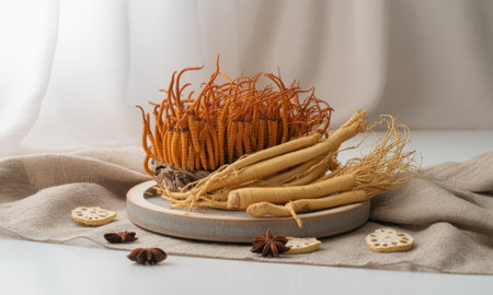 Dried cordyceps mushrooms and ginseng roots, arranged on a ceramic plate with linen fabric. includes star anise and lotus root slices, representing traditional herbal medicine ingredients for health and wellness.